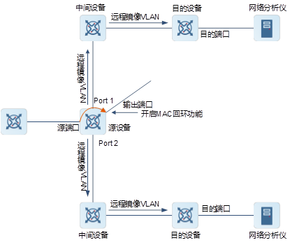 如果源设备与目的设备直接连接,则输出端口将镜像报文输出到目的设备。