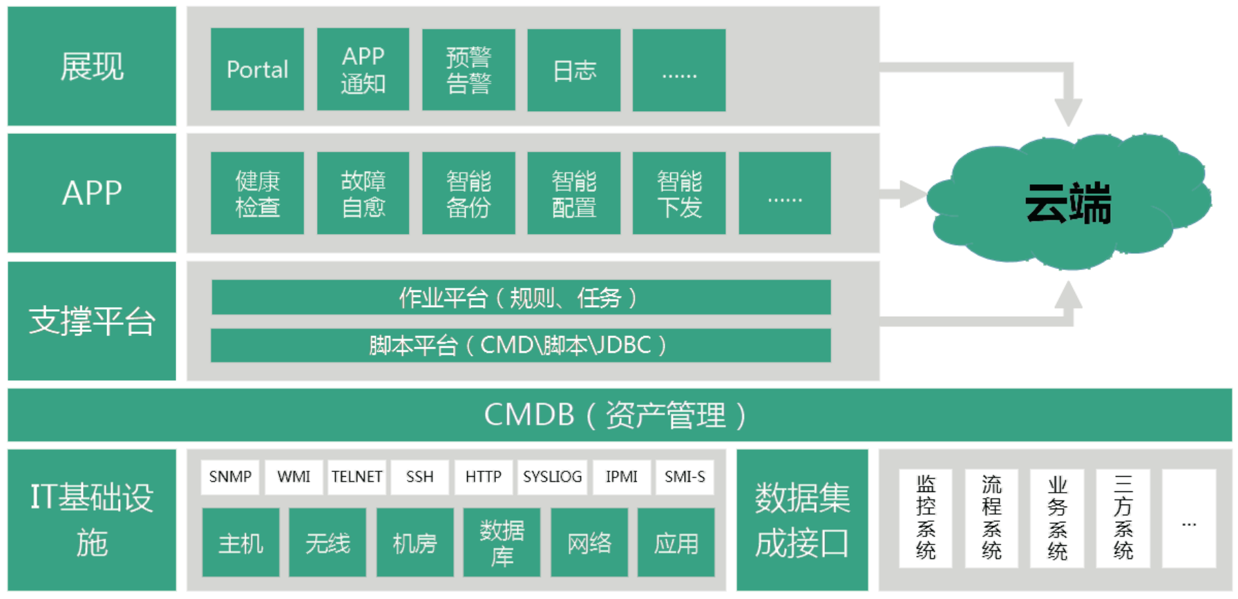 4、智能化:故障智能处理,智能检查、智能备份对比,智能修复、配置。