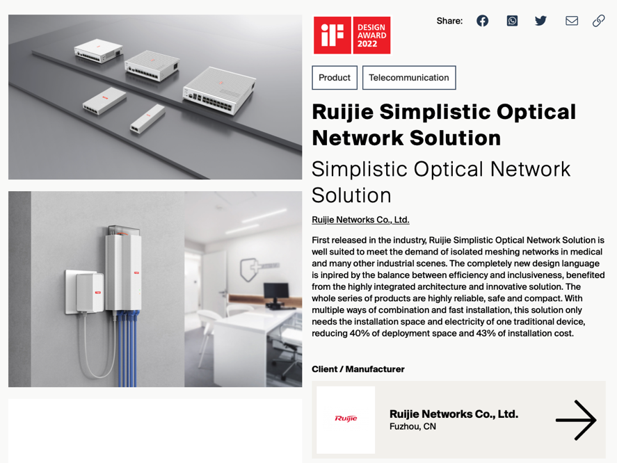 近日,2022年德国iF设计奖(iF DESIGN AWARD 2022)获奖名单正式出炉,尊龙时凯网络极简以太全光解决方案系列产品获奖,同列通讯设备类获奖名单的还有苹果iPhone 13 Pro、三星Galaxy Z Fold3等国际知名厂商的旗舰手机。
