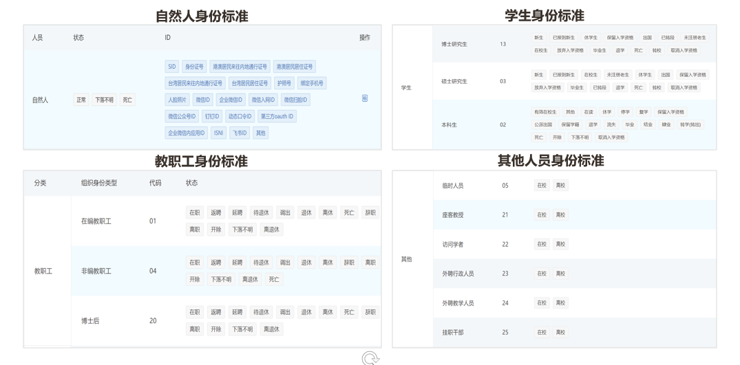 第二,构建全校人员身份标准和生涯状态。SourceID理顺了校内“全人员”的身份,每种人员在校期间的细化状态,并建立了清晰的身份标准。