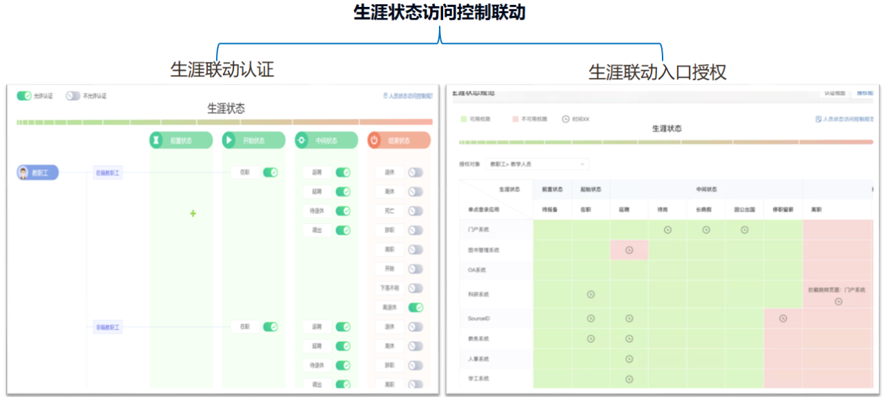 第三,建立全生涯状态联动访问控制体系。简单来说,就是定义什么类型的人在什么状态下,可以登录身份平台以及单点登录到哪些业务系统中。基于身份标准和生涯状态管理,身份分类、准确精细地支撑认证和授权,精准把握了人员状态,使得业务联动响应更及时、更高效。
