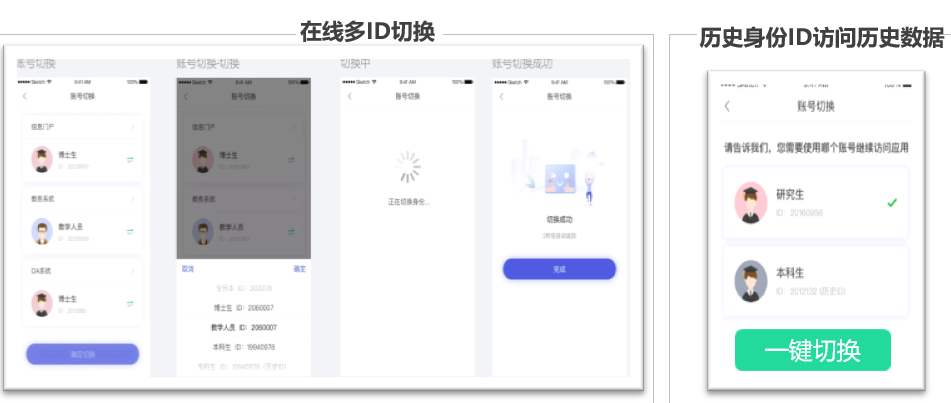 第八,多身份ID账号在线一键切换。针对同一个人在同个时期有多个身份的情况,SourceID身份平台不仅支持多身份ID账号在线切换,还可以快速精准查询历史身份账号信息。