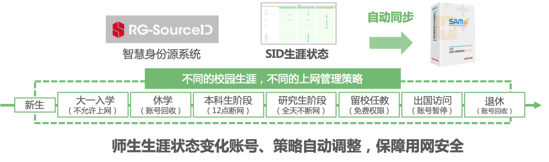 方案联动身份管理软件,实现了师生生涯状态变化账号、策略自动调整,保障用网安全。账号管理清晰,人网权限精准匹配,最大程度降低安全隐患。