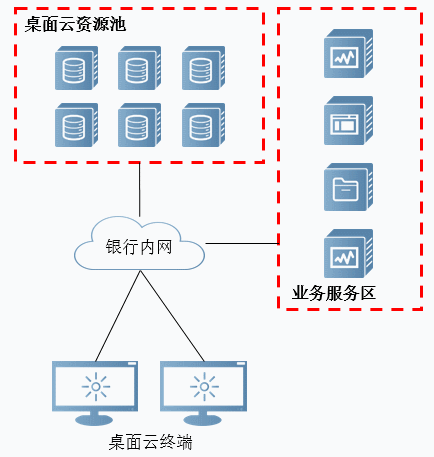 银行员工在自己的桌面云终端上接收服务器端的虚拟机桌面画面,并对虚拟机进行远程操作(和使用传统PC并无区别)。