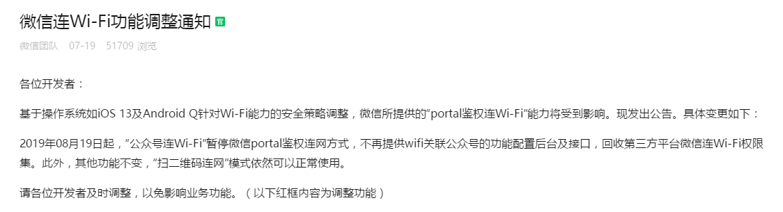接到微信反馈微信连Wi-Fi功能调整通知,具体通知地址如下: