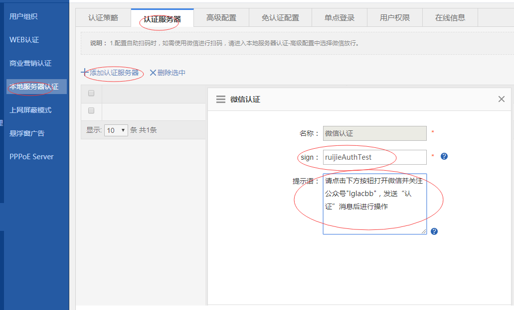 • 进入WEB界面后,在用户-->本地服务器认证--->认证服务器中添加微信认证,