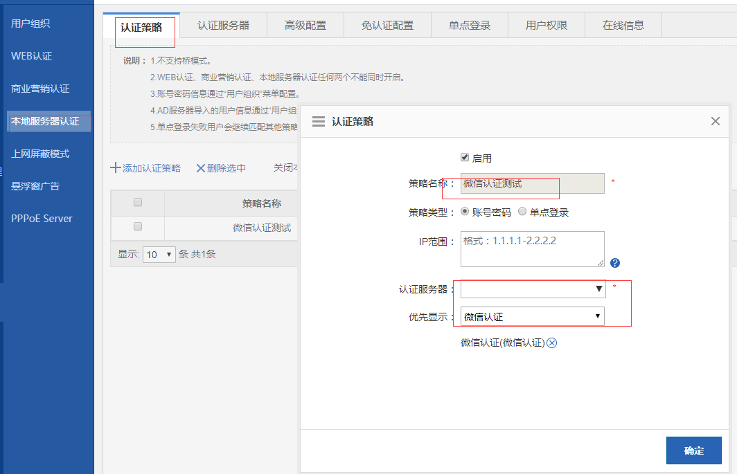 • 进入WEB界面后,在用户-->本地服务器认证--->认证策略中添加策略
