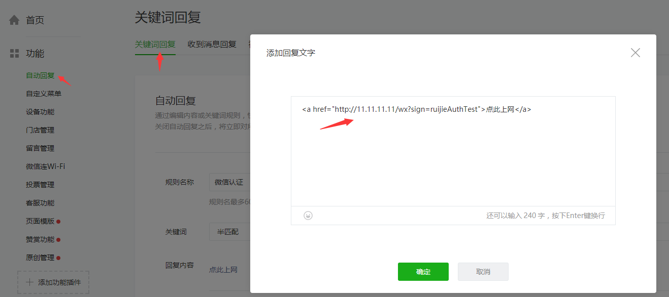 在公众号中需要配置一个认证的url,用户通过访问该url后可以跳转出二维码。 当前设备默认使用http://11.11.11.11/wx。 在公众号里需要配置成如下形式: