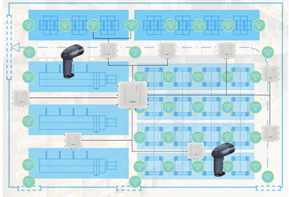 “1分48”零漫游技术通过智分基站和智分单元,将48个无线天线均匀分布在仓库区顶部,每根天线的实际覆盖半径达7-8米。该方案既可以确保在货架林立的场景下实现无线信号无死角全覆盖,又可以保障移动终端在各个天线之间“零漫游”。