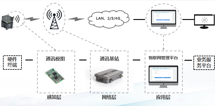 通过传感器采集某些数据(声、光、电等),基于网络层的终端模组,对接到网络层的基站,实现数据采集后的传输。