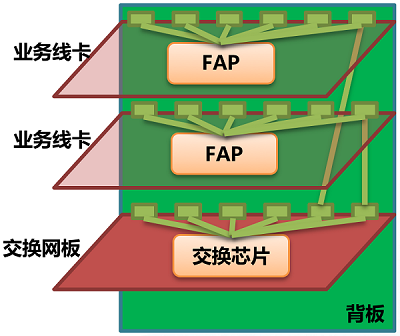 如图2所示,业务线卡通过背板走线连接到Crossbar芯片上,Crossbar芯片集成在主控引擎上。