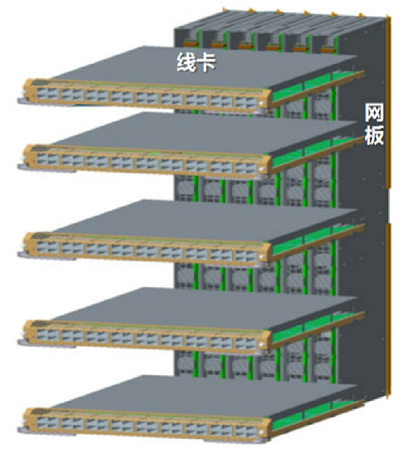 如图7所示,业务线卡与交换网板互相垂直,背板走线为零,甚至无中板。