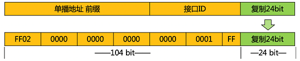 Solicited-node 地址由前缀 FF02::1:FF00:0/104和IPv6单播地址的后24 位组成。如图3所示: