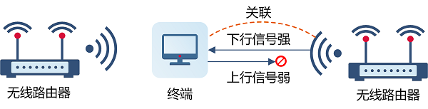 远端关联是指环境中存在多个无线设备时,终端“舍近求远”,关联到了远端的无线设备上。由于无线路由器的Wi-Fi发射功率大于手机、笔记本电脑等终端,终端关联到远端路由器后,能够接收到远端路由器发送的信号,但未必有足够的功率将信号回传至远端——在这种情况下,终端发送数据可能出现丢包、错包等异常,即使Wi-Fi信号显示为满格,也无法正常使用网络应用。