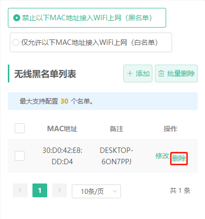 ●   无线黑名单:名单中的设备将被禁止上网,未加入名单的设备不限制。