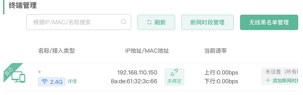 以睿易家用无线路由器为例,在[终端管理]页面可以查看当前连接Wi-Fi的设备信息并拉黑指定设备: