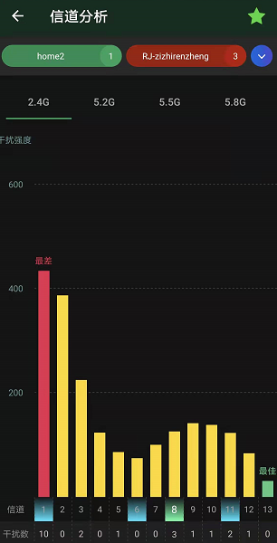 (1)    手机安装“Wi-Fi魔盒”或其他有Wi-Fi扫描功能的APP,查看干扰分析结果,找到最佳信道。