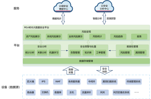 RG-BDS大数据安全平台通过采集设备上的海量信息进行深度分析,从而发现攻击行为,结合云端情报中心、云安全分析中心生成对应的防护策略下发到对应的安全设备,最终构建“设备+平台+服务”的立体化主动防御体系,帮助用户建设可协同的安全网络。